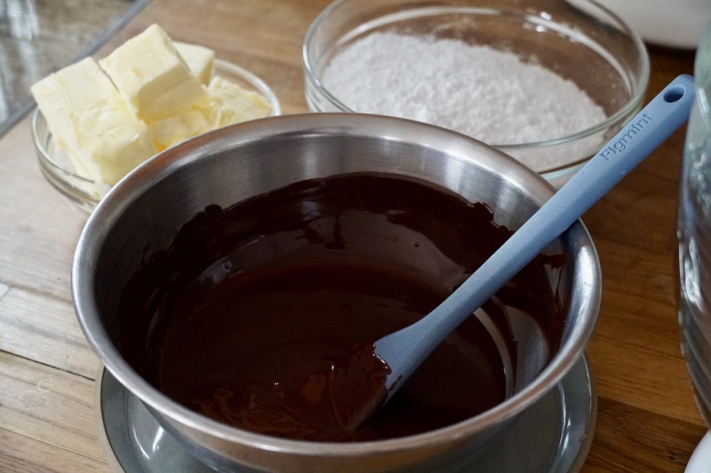 Making the buttercream requires that the chocolate be melted first. We suggest doing this in a double boiler. We do this step old school because we don’t own a microwave, but if you do and you’d rather melt chocolate using one, go ahead.