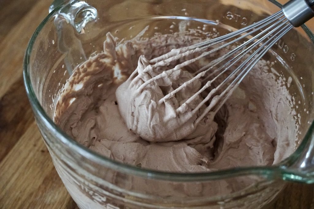 To whip this mocha-flavoured treat, first place all of the ingredients into a medium bowl or large liquid measure. Then take a few moments to whisk everything together. This helps melt the sugar and kosher salt into the heavy 35% whipping cream while also blending the cocoa in thoroughly. Then whip until you have an airy, billowy whipped cream with soft peaks.