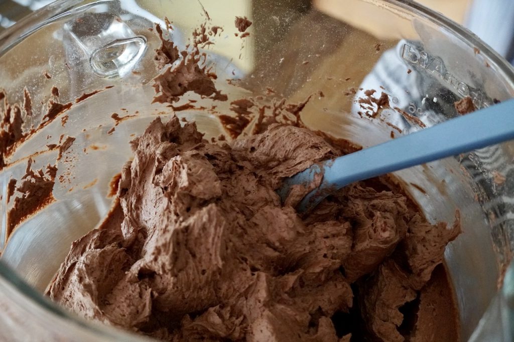 Once the chocolate is cooled to room temperature, add it slowly to the whipped butter, alternating it with the icing sugar. Make sure to scrape down the sides of the bowl as needed so that the confection is creamy and thoroughly combined.