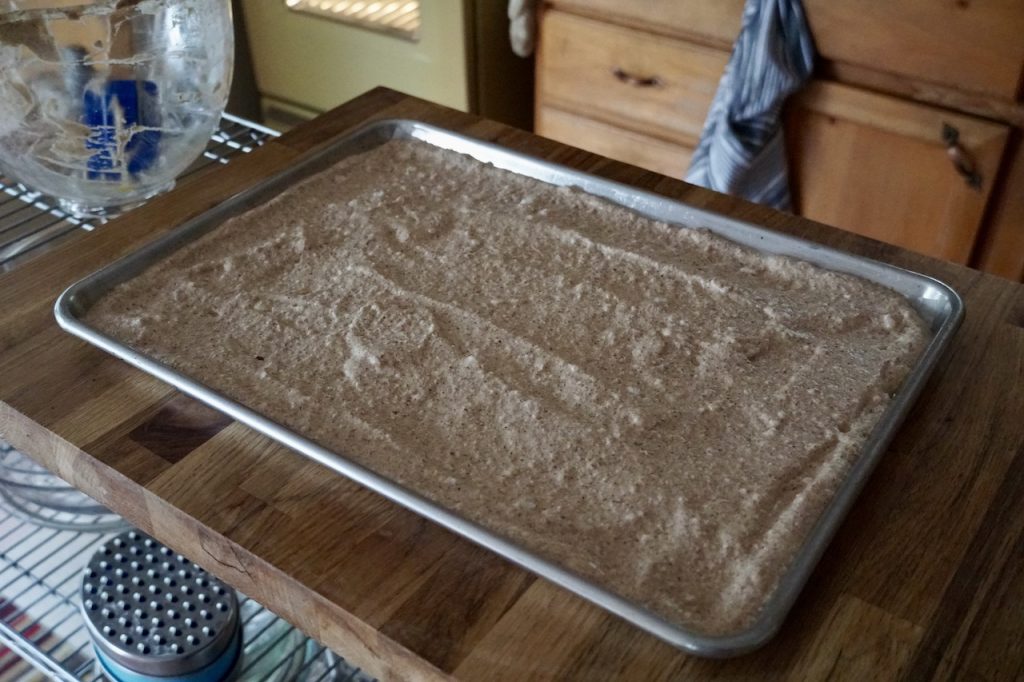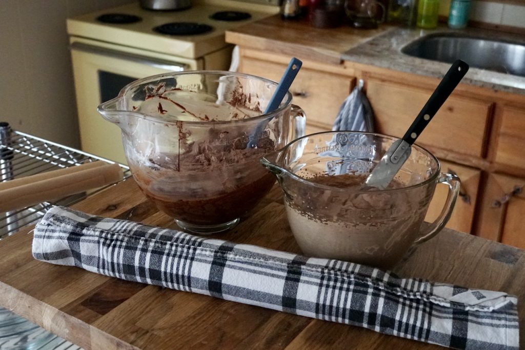 The above photo shows all the ingredients you’ll need – eggs, granulated sugar, ground walnuts, vanilla extract, cocoa powder and a few spices. Before I get into the details, I do want to explain an option you can try when you make the cake layer at home. In our recipe, I went with the number 6: 6 eggs, 6 tablespoons of sugar and 6 tablespoons of ground walnuts. My Mom wanted a thicker sponge to make her layers taller, so she went with 9. My point is that you can make your cake as thin or as thick as you’d like by adjusting those quantities accordingly.