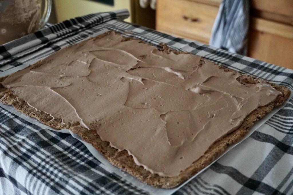 Similar to a jelly roll cake or a Swiss roll, the most common cake used in this type of recipe is a light, airy sponge cake. In planning our version, I took the sage advice of two of my siblings and put their know-how to work using my mom’s recipe for a walnut tort. Although some holiday cakes are made in fancy Bundt pans or fluted springform pans, the sponge cake for this recipe is prepared in a greased baking tray lined with parchment paper.