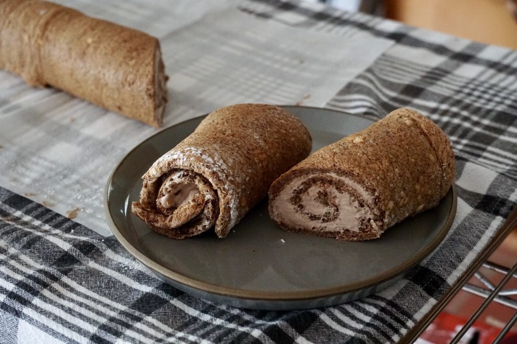 Here’s another opportunity to make this recipe your own. Although my Mom made her cake layer plain, I added a few flavour enhancers to amplify our holiday baking vibes. Adding just a tablespoon of cocoa powder gives the sponge cake a pleasing chocolatey flavour. We then boosted the warming spice notes with cinnamon, nutmeg and cloves. These three spices are often combined for other holiday baking recipes like these GINGERBREAD COOKIES, our CHOCOLATE SPICE COOKIES or this FESTIVE MINCEMEAT. Together with the cocoa, the spices give this yule log recipe such a pleasing taste. In the direction where you whisk the ground nuts with the cocoa and spices, make sure to take a big whiff of that dry mixture. Nice, right?