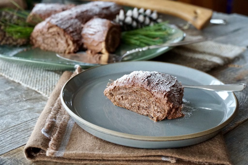 But wanna know what’s really nuts? Our version of this dessert is entirely gluten-free! There I was, listening to Christmas carols, setting up the beauty shot, adding decorations, looking at the finished BÛCHE DE NOËL when my lightbulb moment shone like the entire Christmas tree. Selecting a ground nut option for the dry mix makes this a 100% gluten-free, flourless cake recipe. Truly a holiday miracle!