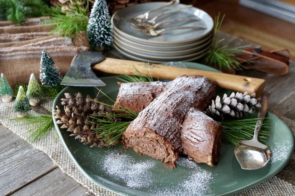 Right before serving this scrumptious dessert, we gave it a light dusting of icing sugar that looks like fresh fallen snow. We also took serving a chocolate log cake to a new level of excitement by bringing out a hatchet to slice. After giving the hatchet axe a good clean, we were able to cut slices in a fun and festive way.