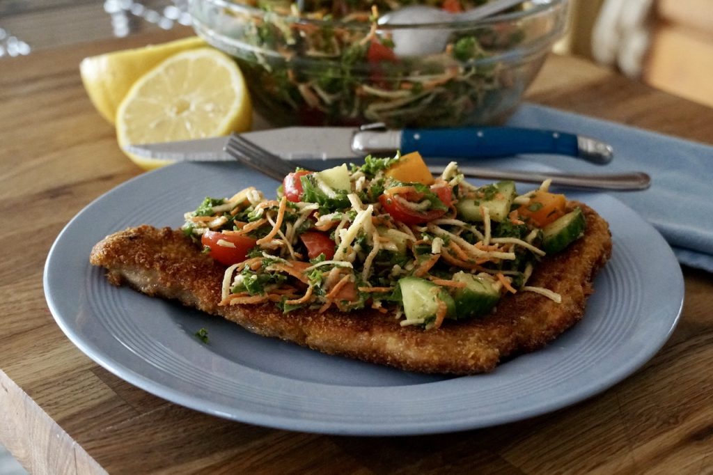 Prepare the slaw: Strip curly leaves away from the woody stems of kale. Place leaves into a food processor fitted with a blade attachment. Zip to chop. Transfer to a large salad bowl. Shred or julienne carrots and parsnips, adding them to the bowl as well. Add prepared cucumbers, tomatoes, peppers, red onion, lemon juice and freshly chopped herbs. Sprinkle bowl with spices. Toss to combine.